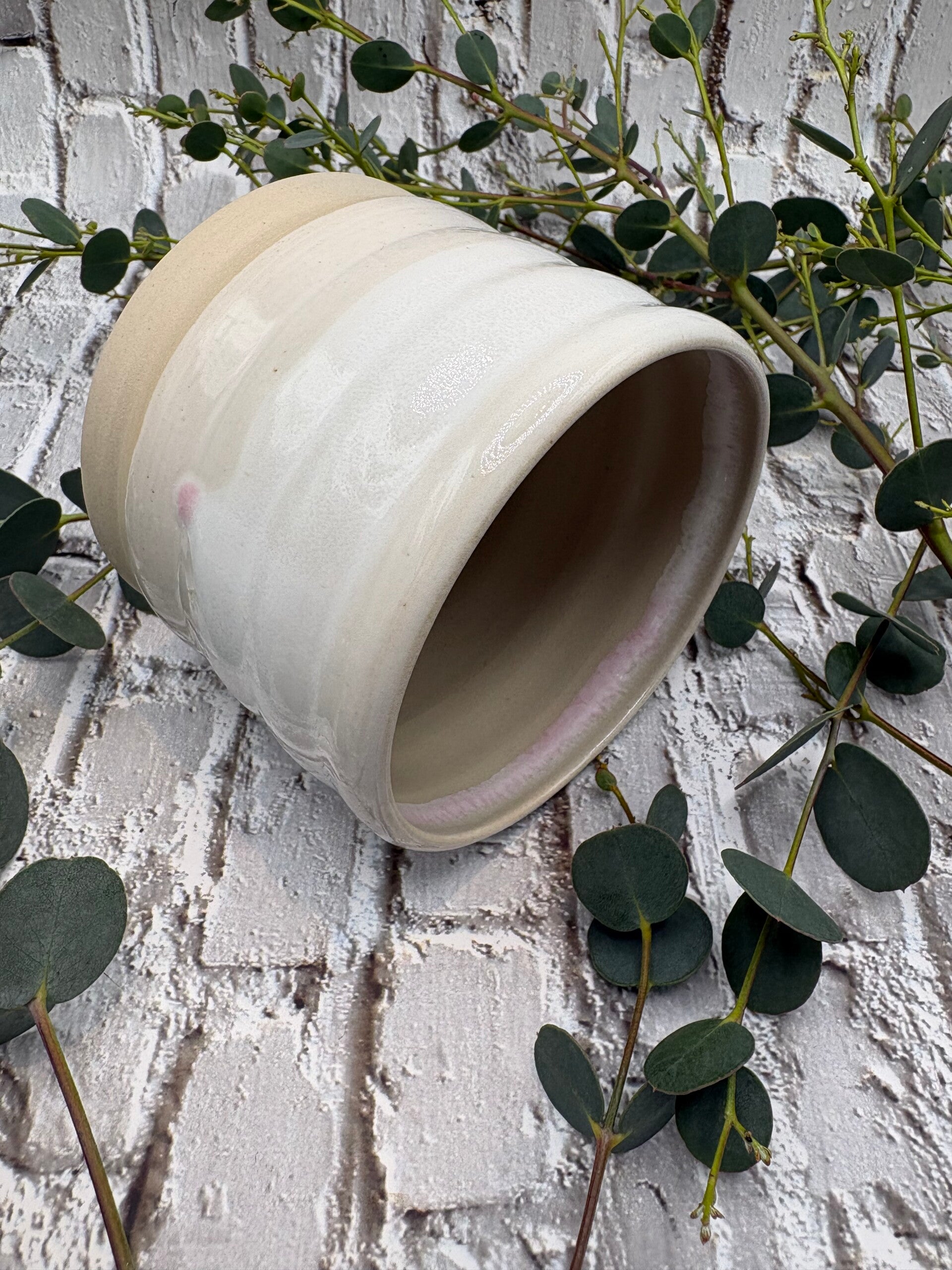 Dieser liebevoll handgedrehte Becher vereint minimalistisches Design mit organischer Formensprache. Die sanften Wellen in der Oberfläche verleihen ihm Charakter und laden dazu ein, ihn immer wieder in die Hand zu nehmen. Die helle, leicht transparente Glasur in zartem Weiß betont die handwerkliche Struktur des Tons und sorgt für eine ruhige, natürliche Ausstrahlung.